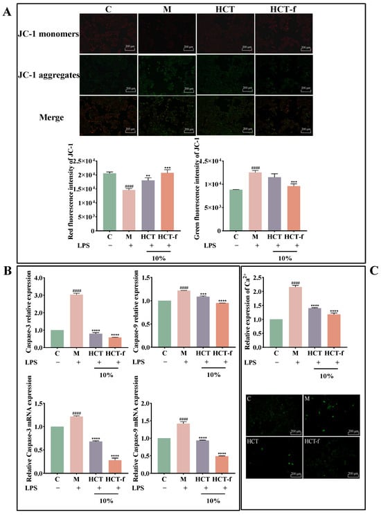 In conclusion, it can be observed that HCT and HCT-f can inhibit LPS injury-induced apoptosis by mitigating the decrease in mitochondrial membrane potential, reducing Ca2+ inward flow, and suppressing the relative expression of Caspase-3 and Caspase-9 and their mRNA.