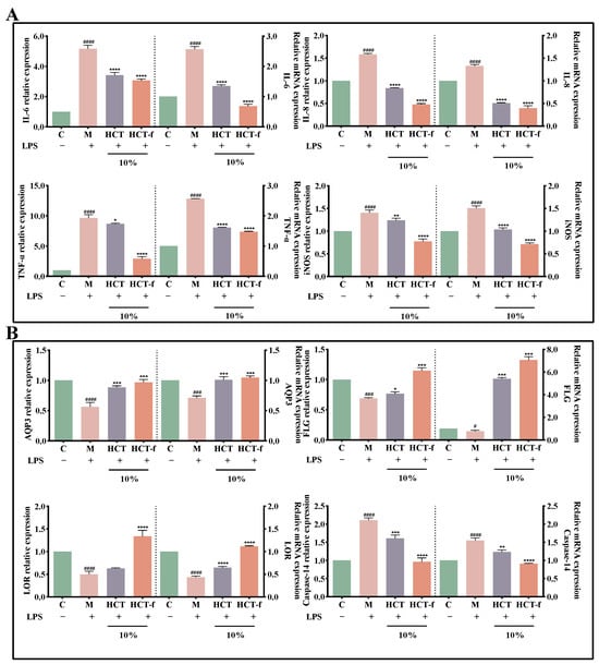 Effects of HCT and HCT-f on the release and transcript levels of inflammatory and barrier factors in LPS-induced injured HaCaT cells. (A) Effects of HCT and HCT-f on the release of IL-6, IL-8, TNF-α, and iNOS, as well as their mRNA expression in HaCaT cells with LPS-induced injury. (B) Effects of HCT and HCT-f on the release of AQP3, FLG, LOR, and Caspase-14, and their mRNA expression in HaCaT cells with LPS-induced injury. One-way ANOVA was performed to determine statistical significance. # p < 0.05, ### p < 0.001, #### p < 0.0001 vs. the control group; * p < 0.05, ** p < 0.01, *** p < 0.001, **** p < 0.0001 vs. the model group.