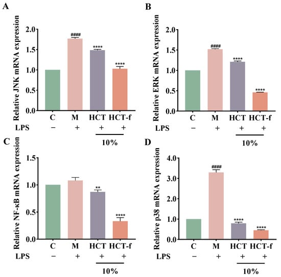 Effects of HCT and HCT-f on gene expression of the JNK, ERK, NF-κB, and p38. (A) JNK; (B) ERK; (C) NF-κB; (D) p38. One-way ANOVA was performed to determine statistical significance. #### p < 0.0001 vs. the control group; ** p < 0.01, **** p < 0.0001 vs. the model group.