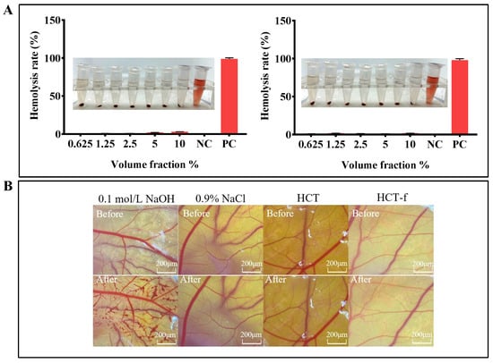 An exploration of the safety of HCT and HCT-f. (A) Effects of HCT and HCT-f on hemolysis of rabbit erythrocytes. (B) Effects of HCT and HCT-f on vascular damage in the chorioallantoic membrane of the chick embryo.