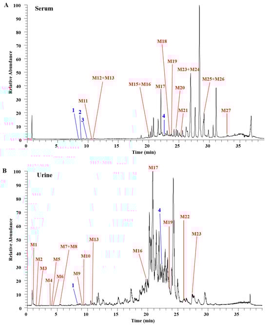 Total ion chromatograms (TIC) of (A) serum sample, (B) urine sample, and (C) characterization of the metabolites of C3G. Peaks marked with 1–4 are related to prototypes, and M1–M27 corresponded to the 27 metabolites of BF.