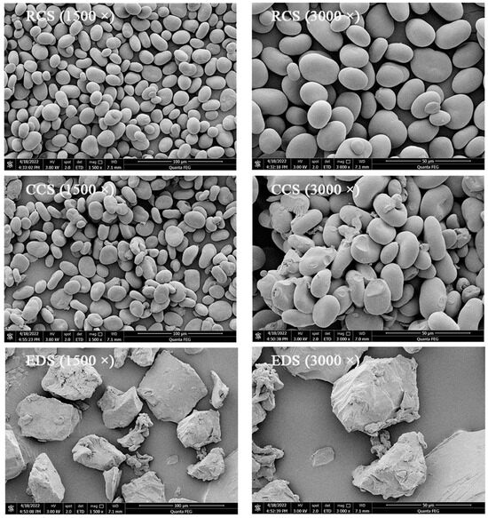 Scanning electron micrographs of modified chickpea starch. RCS, CCS, and EDS denote chickpea starch, citrate-esterified starch, and enzymatically debranched starch, respectively.