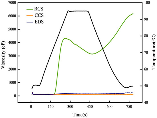 Viscosity curve of modified chickpea starch. RCS, CCS, and EDS denote chickpea starch, citrate-esterified starch, and enzymatically debranched starch, respectively.