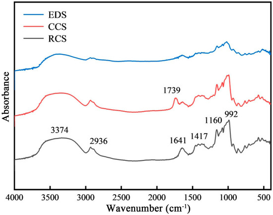 Both CCS and EDS have major characteristic absorption peaks similar to those of RCS. After citric acid esterification, the characteristic peak at 1641 cm−1 was clearly weakened, and a new absorption peak attributed to C=O vibrations formed at 1739 cm-1. The presence of C=O bonds confirmed the successful introduction of a citric acid group into the chickpea starch molecule. Many starches, such as corn starch [34], wheat starch [35], and lentil starch [28], have also been shown to undergo ester bond formation during the synthesis of citrate starch esters. After enzymatic debranching, the amount of adsorbed hydrogen-bonded O-H groups in starch decreased, and its spectrum remained similar to that of native starch, indicating that the chemical groups of starch were not changed by enzymatic debranching. This indicates that more hydroxyl groups are involved in the formation of crystals during enzymatic debranching.