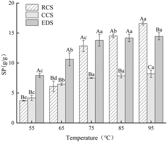 Expansion force of chickpea starch and modified chickpea starch. Each value represents mean ± SD. Different letters (a–e) indicate significant differences from each other at the different temperatures. Different letters (A–C) indicate significant differences from each other at the same temperature. Statistical analysis was performed using one-way ANOVA with Tukey’s post hoc test. RCS, CCS, and EDS denote chickpea starch, citrate-esterified starch, and enzymatically debranched starch, respectively.