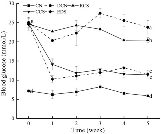 The concentrations of blood glucose in the mice. The blood glucose levels were measured weekly during the experimental period (5 weeks). The data are shown as the means ± SDs. Different letters (a–d) indicate significant differences from each other. A statistical analysis was performed using a one-way ANOVA with Tukey’s post hoc test. CN, DCN, RCS, CCS, and EDS denote the normal control group, high-fat and high-sugar control group, chickpea raw starch group, citrate-esterified starch group, and enzymatically debranched starch group, respectively.
