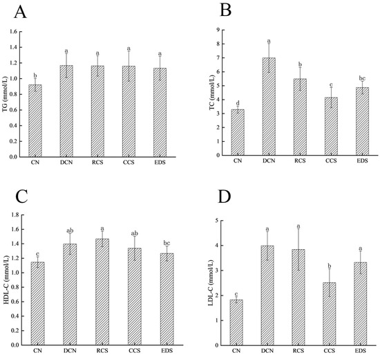 The concentrations of TGs (A), TC (B), HDL-C (C), and LDL-C (D) in mice. Each value represents the mean ± SD. Different letters (a–c) indicate significant differences from each other. A statistical analysis was performed using a one-way ANOVA with Tukey’s post hoc test. CN, DCN, RCS, CCS, and EDS denote the normal control group, high-fat and high-sugar control group, chickpea raw starch group, citrate-esterified starch group, and enzymatically debranched starch group, respectively.