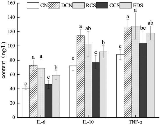 Serum inflammatory factor levels in mice. Each value represents the mean ± SD. Different letters (a–c) indicate significant differences from each other. Statistical analysis was performed using one-way ANOVA with Tukey’s post hoc test. CN, DCN, RCS, CCS, and EDS denote normal control group, high-fat and high-sugar control group, chickpea raw starch group, citrate-esterified starch group, and enzymatically debranched starch group, respectively.
