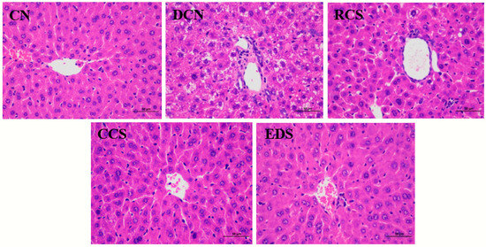 The liver tissues of the mice in each group were stained and observed. As shown in Figure 8, the liver tissues of mice in the CN group were structurally intact, well-organised hepatocytes displaying a radial arrangement around the central vein. Moreover, intact nuclei were observed, and intracellular fat droplets were never found in liver tissues. In contrast, the liver lobules of the mice in the DCN group were disrupted with many lipid vacuoles and extensive hepatocyte degeneration. After the intervention, the damaged liver tissue structures in the DCN group, CCS group, and EDS group were restored, and the phenomenon of lipid vacuoles was significantly improved. The results of the CCS group and EDS group tended to be similar to those of the normal group, indicating that CCS and EDS significantly inhibited the development of the fatty liver.