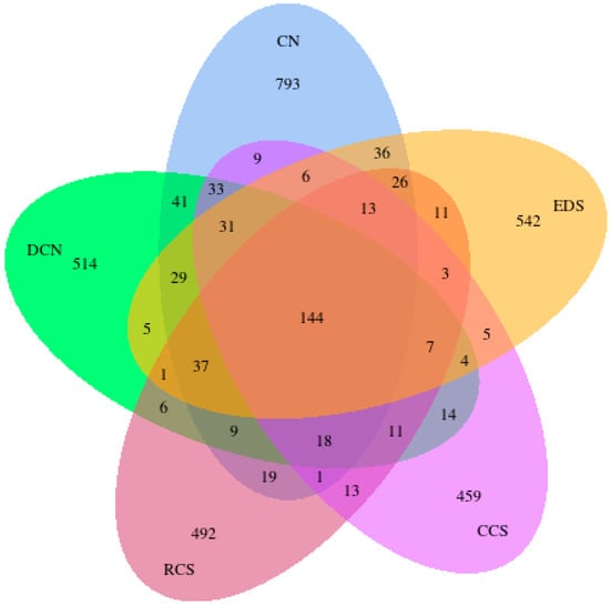 Sample Venn diagram. CN, DCN, RCS, CCS, and EDS denote normal control group, high-fat and high-sugar control group, chickpea raw starch group, citrate-esterified starch group, and enzymatically debranched starch group, respectively.