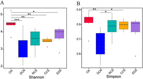 An alpha diversity analysis indicated by the Shannon index (A) and Simpson index (B). * p < 0.05; ** p < 0.01, *** p < 0.001. CN, DCN, RCS, CCS, and EDS denote the normal control group, high-fat and high-sugar control group, chickpea raw starch group, citrate-esterified starch group, and enzymatically debranched starch group, respectively.