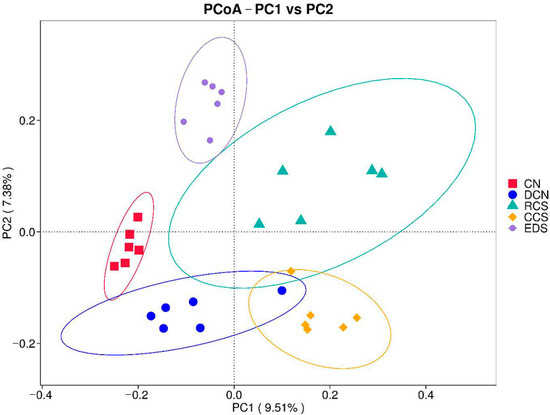 PCoA based on Jaccard. CN, DCN, RCS, CCS, and EDS denote normal control group, high-fat and high-sugar control group, chickpea raw starch group, citrate-esterified starch group, and enzymatically debranched starch group, respectively.