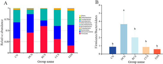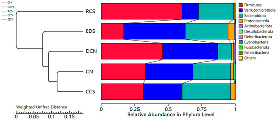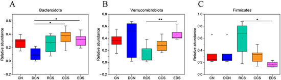 The distribution of the intestinal microbiota in each group of samples at the phylum-level is shown in Figure 14A. The main bacterial groups in the samples at the phylum level were Firmicutes, Verrucomicrobiota, Bacteroidota, and Proteobacteria. The abundance of Firmicutes in the RCS group was significantly greater (p < 0.05) than that in the EDS group. Compared with that in the DCN group, the abundance of Bacteroidota in the CCS group and EDS group was significantly greater (p < 0.05), and there was no significant difference between the two groups. In terms of Verrucomicrobiota, the abundance in the EDS group was significantly greater than that in the RCS group (p < 0.01), and there was no significant difference among the DCN group, CN group, and CCS group (Figure 15). In addition, EDS increased the abundance of Proteobacteria.