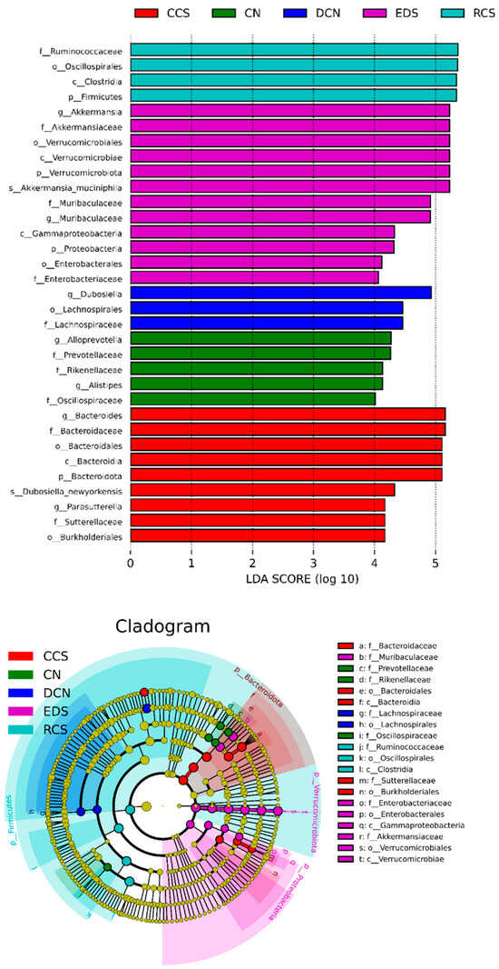 The differentially abundant species in the CN group were Prevotellaceae, Rikenellaceae, Oscillospiraceae, AlloPrevotella, and Alistipes (Figure 13). The differentially abundant species in the DCN group were Lachnospiraceae, Dubosiella, and Akkermansiaceae. In the RCS group, the differentially abundant species were Firmicutes, Ruminococcaceae, and Oscillospiraceae. The differentially abundant species in the CCS group were Bacteroidota, Bacteroidaceae, Sutterellaceae, Bacteroides, and Parasutterella. The differentially abundant species in the EDS group were Verrucomicrobiota, Akkermansiaceae, Enterobacteriaceae, Akkermansia, and Muribaculaceae.