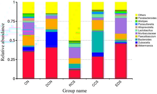 A histogram of relative species richness at the genus level. CN, DCN, RCS, CCS, and EDS denote the normal control group, high-fat and high-sugar control group, chickpea raw starch group, citrate-esterified starch group, and enzymatically debranched starch group, respectively.