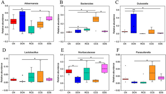 Statistical plots of significant differences in species among groups. (A) Akkermansia. (B) Bacteroides. (C) Dubosiella. (D) Lactobacillus. (E) Muribaculaceae. (F) Parasutterella. * p < 0.05; ** p < 0.01. CN, DCN, RCS, CCS, and EDS denote normal control group, high-fat and high-sugar control group, chickpea raw starch group, citrate-esterified starch group, and enzymatically debranched starch group, respectively.