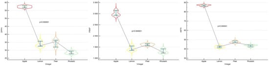 The total polyphenol contents (TPCs) of the vinegars tested ranged from 61.05 to 191.97 mg GAE/L. The apple vinegar exhibited the highest values for this parameter, whereas the pear vinegar had the lowest. Statistically significant differences were observed between all vinegars except for the rhubarb vinegar vs. the lemon vinegar (Table 4).