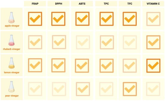 A detailed analysis of the antioxidant properties of lemon, rhubarb, pear, and apple vinegars was carried out by measuring the vinegars’ ferric ion reducing ability (FRAP) and neutralizing radicals (DPPH, ABTS).
