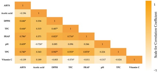 Spearman’s rank correlations between the tested parameters for the different types of vinegars. *—statistically significant (p ≤ 0.05).