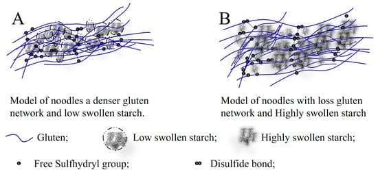 These interactions of starch/protein at the stage of dough mixing are impacted by many factors, such as amylose/amylopectin ratio, starch granular size, damaged starch and gluten composition. The effect of the amylose/amylopectin ratio on the interaction of starch/gluten is linked to its effect on water absorption. A higher amylopectin content can augment the water absorption capacity and reinforce the competitive nature of starch against gluten during dough mixing [88,89]. Li et al. [42] further propose that non-covalent bonds are established between starch granules and gluten, exerting an influence on the texture and digestibility of noodles. Variations in the distribution of starch granule sizes lead to a range of starch/protein interaction areas and strengths [8,86,90]. Increasing the presence of small starch granules augments the interaction area between starch and protein [30]. Initially, this effect boosts mixing properties, water absorption, dough strength, and the firmness of noodles and pasta [56]. Recent research by Yan and Lu, (2021) [49] suggests that starch granules play a role in shaping the gluten network through physical or chemical interactions. Moreover, a higher percentage of small granules can significantly densify the gluten network, resulting in an upward trend in noodles firmness [91]. Shang et al. [91] suggest that starch interacts with gluten via non-covalent bonds, whereby an increase in B-type starch granules intensifies hydrogen interactions while decreasing hydrophobic interactions. Consequently, this results in an elevated β-structure and ultimately enhances noodle quality. The model depicting noodles prepared using wheat flour with varying starch granule sizes is illustrated in Figure 2. Unlike B-type starch, increased damaged starch can disrupt the bond within gluten due to leached starch chains from the damaged starch [92]. This may due to the free hydroxyl group, which occurred during mechanical activation, and can interact with the sulphydryl groups of cysteine residues in the polypeptides of gluten protein, leading to decreased disulfide bonds. It is also noted that starch interacts with gluten in the dough through hydrophobic forces, which can be mitigated by a higher gliadin content at an optimal mixing phase [93].