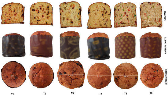 Images of the crumb, lateral crust and upper crust of commercial and traditional panettone samples. (T1: commercial panettone stuffed with raisins and candied fruits; T2: commercial panettone with raisins and candied fruit, free of potassium bromate; T3: premium commercial panettone; T4: commercial panettone with raisins and candied fruit; T5: traditional panettone with Andean ingredients of great nutritional value; T6: traditional panettone with Andean ingredients of great nutritional value with sweetener).