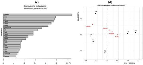 In Figure 2a, the map of panettone samples is observed, where this discriminative test generates four groups, where T1 and T2 form a group, T5 and T6 another group and samples T3 and T4 form independent groups; these last samples show a clear separation from the rest of the samples. Regarding the representation of consumers, an expected heterogeneity is revealed in the grouping of the samples, which can be explained by the interindividual variability between consumers. Figure 2c shows the list of terms or words most frequently generated by consumers when describing the samples, which are pleasant, sweet, dry, lots of smell, lots of flavor, spongy, good texture and soft, which recorded frequencies greater than 30% mention. Figure 2d presents the sensory map through CA explaining 45.82% of the total variability in the first two dimensions. The location of the samples is explained mainly by the type of products; the traditional samples are grouped by their ingredients and the commercial ones by certain characteristics reported by consumers. When observing the classification, samples T1 and T2 were described by a percentage of consumers as yellow in color; a similar behavior is observed for T4 characterized as yellow in color by another group of consumers, although this is different in other attributes from the rest of the samples. Sample T5 and T6 are characterized by having a lot of smell, flavor and fruits. Sample T3 is different from the other samples described with little yellow and low flavor, because it has a simpler formulation compared to the other samples. It uses basic ingredients such as wheat flour, sugar, vegetable fat, yeast, candied fruits, eggs and certified essences. Through the consensus of words, the most used attributes were yellow color, fruit, strong aroma and flavor. Sensorially, it is not expected that samples T5 and T6 were described in a similar way, since T6 has a sweetener that replaces sugar; however, consumers did not perceive this change, which indicates that it is viable to replace the sugar content in panettone. This method allowed us to record how consumers perceive the sensory attributes of panettone, reaching a consensus, grouping the samples according to their similarities. These dissimilarities or similarities can be generated by the quality of ingredients such as flour, yeast, dried fruit and spices, which can significantly affect the flavor and texture of the panettone [57,58].
