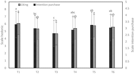 Acceptability and purchase intention graphs. (T1: commercial panettone stuffed with raisins and candied fruits; T2: commercial panettone with raisins and candied fruit, free of potassium bromate; T3: premium commercial panettone; T4: commercial panettone with raisins and candied fruit; T5: traditional panettone with Andean ingredients of great nutritional value; T6: traditional panettone with Andean ingredients of great nutritional value with sweetener). Different letters indicate significant differences.
