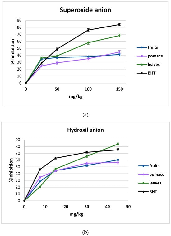 The data presented in Figure 1a,b showed that BHT is the most effective scavenger of superoxide and hydroxyl radicals. Considering the three blackcurrant samples, increasing concentrations of plants exhibited increasing inhibition power of free radicals. The analytical evaluation of 100 and 150 mg/kg of plant extract (for superoxide anion inhibition) and 30–45 mg/kg plant extract (for hydroxyl radical anion inhibition) revealed no significant differences between pomace and fruit behavior. However, the leaf samples exhibited over 50% higher superoxide anion when compared with fruits and pomace and an average of 30% higher hydroxyl anion.