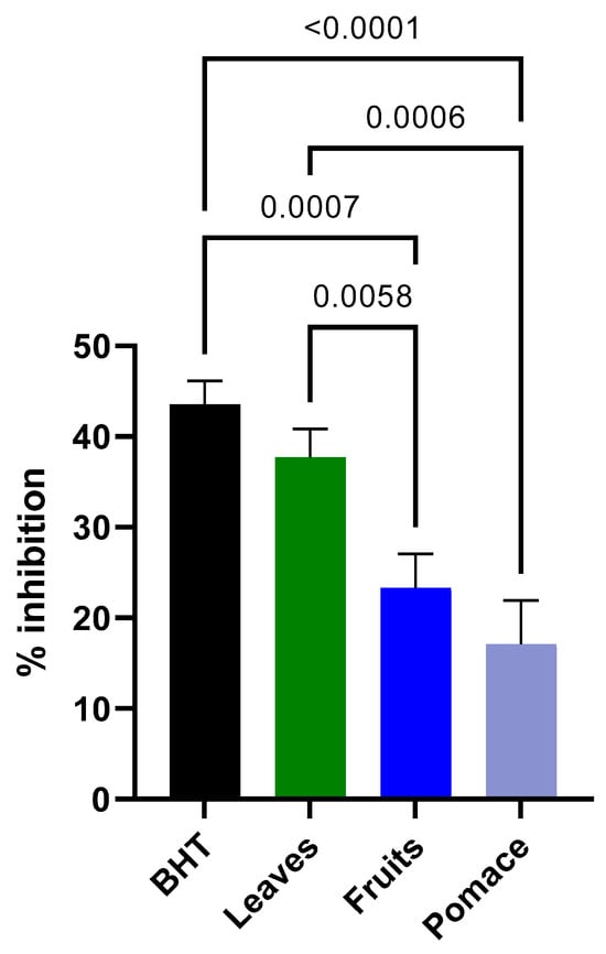 In Figure 2, the inhibition potential evaluation of extracts showed there are no statistical differences between BHT and leaf extract-treated samples. Fruits and pomace-treated samples exhibited significantly less inhibition power compared to the rest of the samples.
