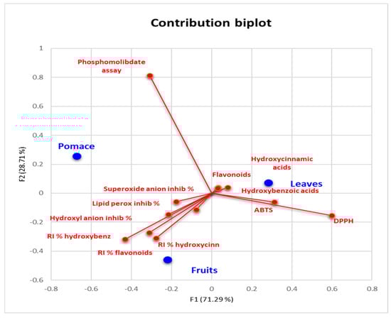 The first observation regarding the correspondence analysis of the described system is related to the independence test. The results indicated that the chi-square observed value > the chi-square critical value and p < 0.0001, which means that our studied parameters are significantly associated with the vegetal materials. The larger distance to the origin indicates dissimilarities between parameters and the mean profile. In our study, the inhibition potential against biological radicals, lipid peroxidation, and concentrations of polyphenol classes present the shortest distance to the origin, indicating that those parameters are closely related to the mean of the system. According to the squared cosine table, all studied parameters are attributed to factor F1, except the phosphomolybdenum assay, and regarding vegetal materials, leaves and pomace are related to factor F1 and fruits to factor F2. It can be observed that polyphenol classes and non-biological radicals (ABTS and DPPH) are plotted on the opposite side with recovery indices, biological radicals, and lipid peroxidation inhibition. This graphical arrangement suggests that the parameters are clusters with different profiles. Leaves and pomace are also on opposite sides of the F1 axis, indicating different profiles. Correspondence analysis indicated the association of leaves with polyphenol classes, while fruits were associated with their recovery indices.