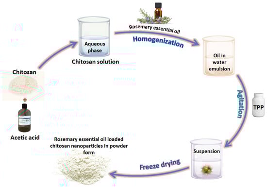 Chitosan (purchased from HiMedia laboratories) was used as a nanoencapsulating material. Nanoencapsulation of REO was achieved by the ionic gelation method [25] and illustrated in Figure 1. Chitosan (1 mg/mL) was dissolved in 1% acetic acid (w/v) and resultant solution was sonicated. Thereafter, it was subjected to centrifugation (Eppendorff-5801R) at 10,000 rpm for 30 min. The supernatant was removed and precipitate filtered through filter paper (1 µm pore size) to obtain a clear aqueous chitosan solution. The obtained solution was then homogenized (WiseTis®, Wertheim, Germany) to obtain an emulsion. Sodium triphosphate pentabasic (TTP) solution (Sigma Aldrich, Bangalore, India; 1 mg/mL) was added into the agitated emulsion under constant stirring for 40 min to obtain REO-loaded chitosan nanoparticles. Centrifugation was performed again at 4 °C for 30 min at 10,000 rpm and several washings were given. The ultrasonication was performed thereafter at 40 KHz for 5 min using an ultrasonic probe. Unloaded chitosan nanoparticles were prepared by the same procedure without the addition of REO. The solutions were frozen to −18 °C and subjected to freeze drying (LyovapourTM L-200, BUCHI, Flawil, Switzerland). The freeze-dried materials were kept in air-tight containers and stored at −18 °C until use.