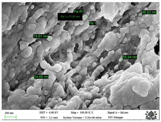 The scanning electron microscopy result regarding the morphology of REO-loaded nanoparticles is shown in Figure 2. The REO-loaded nanoparticles were mostly of spherical shape with a smooth surface, with agglomeration at some places. Further, the majority of the particles were less than 100 nm in size.