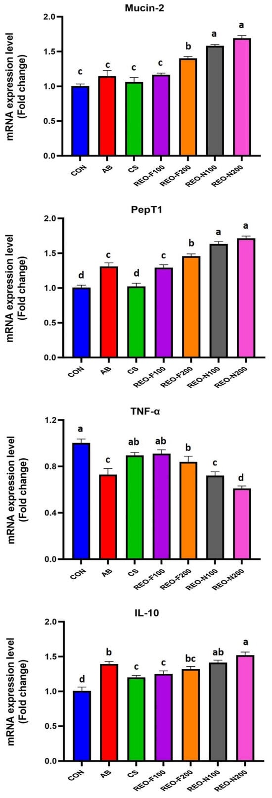 The effects of dietary treatments on the gene expression are shown in Figure 3. The expression of the Mucin 2 gene was upregulated (p < 0.001) in REOF200-, REON100- and REON200-supplemented groups. The greatest expression was noticed in the REON200 group. PepT1 gene expression was upregulated (p < 0.001) in the REON100 and REON200 groups when compared with the CON, followed by the AB, REOF100 and REOF200 groups. TNF-α gene expression decreased significantly (p < 0.001) in the REOF200, REON100 and REON200 groups when compared to the control. The gene expression of IL-10 was higher significantly (p < 0.001) higher in all dietary treatments than CON, with maximum upregulation in the REON200 group.