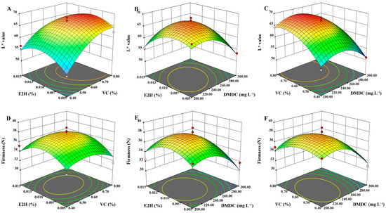 In Figure 1, the response surface plots show the effects of different independent factors on the L* value and firmness of potatoes. When the concentration of DMDC was 250 mg/L and the concentration of VC was in the range of 0.60% to 0.70%, the higher L* value was observed (Figure 1A). The L* value in potatoes was discovered to be lower when the concentration of VC was fixed at 0.60%, and the more the E2H concentration and DMDC concentration departed from the central level, implying that the interaction between these two variables had a significant impact on the L* value (p < 0.05) (Figure 1B). In addition, when the concentration of E2H was fixed at 0.010%, the more DMDC concentration departed from the central level, and the faster the L* value decreased (Figure 1C). The interaction effects of different factors in firmness are shown in Figure 1D–F. Lower firmness was noted as the E2H and VC concentrations departed more from the center level at a DMDC concentration of 250 mg/L. Moreover, when VC concentration was fixed at 0.60%, the more DMDC concentration deviated from the central level, the surface of the firmness model became steeper. The VC concentration between 0.60% and 0.70% and the concentration of DMDC at about 240 mg/L could maintain a higher firmness in potatoes.