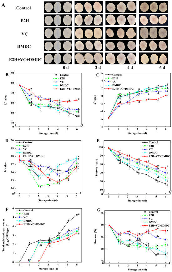 The combined treatment of E2H, VC, and DMDC maintained the quality of potatoes. (A) The visual appearance of potatoes during storage. The variations in potatoes during storage in terms of (B) L* value, (C) a* value, (D) b* value, (E) sensory score, (F) total mold and yeast count, and (G) firmness. Vertical bars indicate the SE of triplicate assays. Different letters indicate significant differences (p < 0.05).
