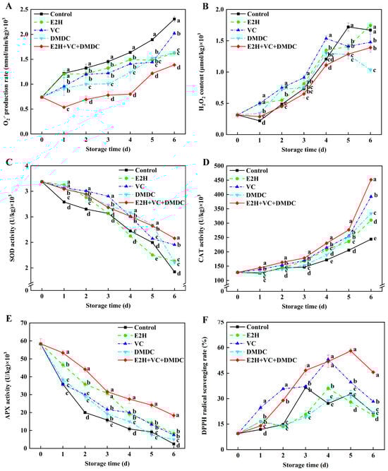 The combined treatment of E2H, VC, and DMDC modulated ROS metabolism in potatoes. The variations in potatoes during storage in terms of (A) O2•− production rate, (B) H2O2 content, (C) SOD activity, (D) CAT activity, (E) APX activity, and (F) DPPH radical scavenging rate. Vertical bars indicate the SE of triplicate assays. Different letters indicate significant differences (p < 0.05).