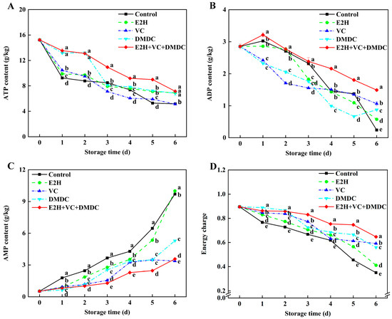 The combined treatment of E2H, VC, and DMDC modulated substance contents of energy metabolism in potatoes. The variations in potatoes during storage in terms of (A) ATP content, (B) ADP content, (C) AMP content, and (D) energy charge. Vertical bars indicate the SE of triplicate assays. Different letters indicate significant differences (p < 0.05).