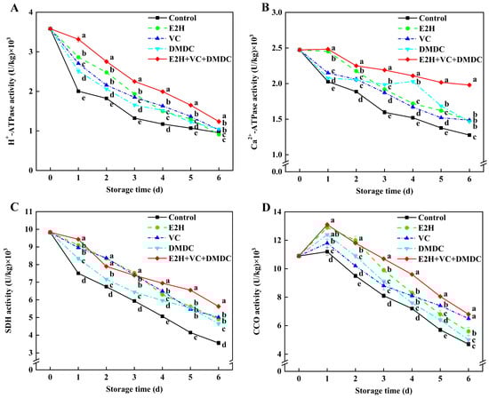 The combined treatment of E2H, VC, and DMDC modulated enzyme activities of energy metabolism in potatoes. The variations in potatoes during storage in terms of (A) H+-ATPase, (B) Ca2+-ATPase, (C) SDH, and (D) CCO activities. Vertical bars indicate the SE of triplicate assays. Different letters indicate significant differences (p < 0.05).