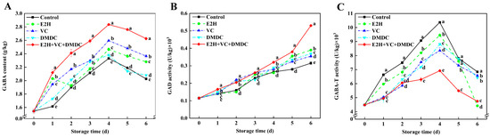 The treatment of combined E2H, VC, and DMDC modulated GABA metabolism in potatoes. The variations in potatoes during storage in terms of (A) GABA content, (B) GAD, and (C) GABA-T activities. Vertical bars indicate the SE of triplicate assays. Different letters indicate significant differences (p < 0.05).