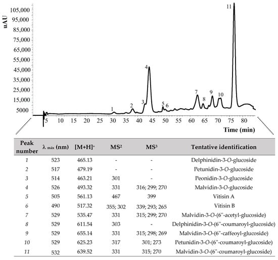 HPLC–DAD/ESI-MS chromatogram and profile of anthocyanins compounds detected in free polyphenol fractions obtained from grape pomace (Touriga Nacional variety). MS2—first pseudomolecular ion fragmentation pattern; MS3—second pseudomolecular ion fragmentation pattern.