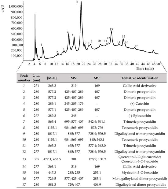 The results presented in Figure 2 indicate the presence of several proanthocyanidins, flavonols, and phenolic acids, namely (+)-catechin, (−)-epicatechin, digalloylated dimer procyanidin, digalloylated trimer procyanidin, dimeric procyanidin, gallic acid derivative, monogalloylated dimer procyanidin, myricetin-3-O-hexoside, quercetin-3-O-glucuronide, quercetin-3-O-hexoside, tetrameric procyanidin, and trimeric procyanidin, each with a unique set of potential bioactivities.