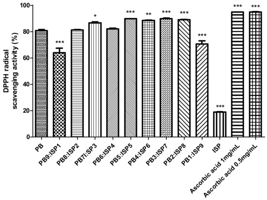 DPPH radical scavenging activity shown across different ratios of the PB larvae and ISP mixture, ranging from PB9:ISP1 to PB1:ISP9, determined using a spectrophotometric method. Scavenging activities are presented in percentages. Ascorbic acid is used as a control at concentrations of 1 mg/mL and 0.5 mg/mL for reference. Values are presented as means ± SD (n = 3). All p-values were obtained by one-way ANOVA following Dunnett’s multiple comparison test; * p < 0.05, ** p < 0.01, and *** p < 0.001.