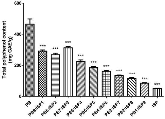 Total polyphenol content across various ratios of the PB larvae and ISP mixture, ranging from PB9:ISP1 to PB1:ISP9, measured using the Folin-Ciocalteu method. Contents are quantified in mg GAE/g. Values are presented as means ± SD (n = 3). All p-values were obtained by one-way ANOVA following Dunnett’s multiple comparison test; *** p < 0.001.