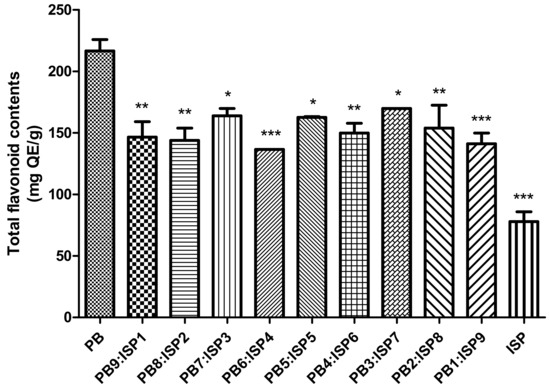 Total flavonoid content across various ratios of the PB larvae and ISP mixture, ranging from PB9:ISP1 to PB1:ISP9. Contents are quantified in mg QE/g. Values are presented as means ± SD (n = 3). All p-values were obtained by one-way ANOVA following Dunnett’s multiple comparison test; * p < 0.05, ** p < 0.01, and *** p < 0.001.
