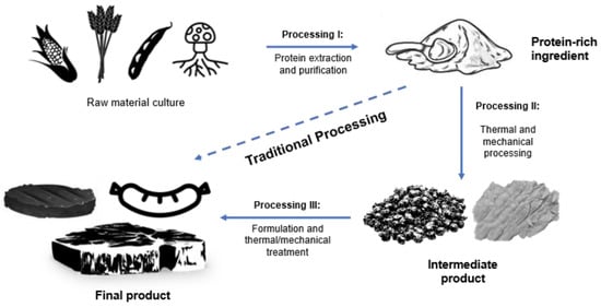 In Figure 1, a schematic representation of a possible processing chain for the production of meat analogues is depicted. There are different steps including the culture of the raw material, protein extraction, thermal and mechanical processing, and (re)-formulation. Since the cultivation step is a complex topic on its own it will not be considered in this review. The starting point are consequently the raw materials obtained after harvesting, e.g., peas and soybeans. The processing conditions during the protein extraction from these sources depend on the raw material itself and the desired protein quality.