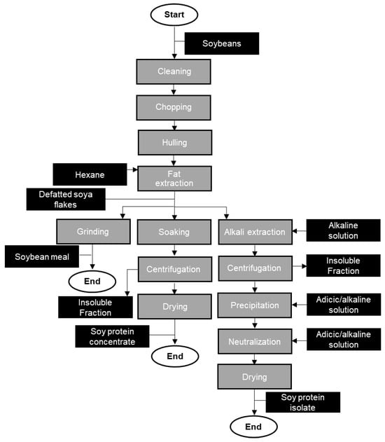 Wet fractionation is chosen for the manufacturing of protein isolates, mainly from legumes and oilseeds, e.g., soybeans or canola. In Figure 2, an exemplary process flow to produce soybean meal, soy protein concentrate, and soy protein isolate is depicted. For protein extraction from oil seeds, usually, a defatting step is added after cleaning, chopping, and hulling. Solvents like petroleum ether, n-hexane, and n-pentane are used during the defatting step to remove most of the oil present since it might interfere with protein extraction []. If no defatting step is necessary, the extraction process includes grinding, a hydration step with a pH shift, and a decanting or centrifugation step to remove the starch and insoluble fiber. Thereafter, protein precipitation, separation, and concentration are performed. The protein is precipitated, either by chemicals and solvents or by isoelectric point precipitation and recovered by centrifugation []. Isoelectric precipitation is often used for legumes to extract the globulin protein fractions, followed by a spray-drying step []. The manufacturing of pea protein isolate follows a similar approach, without the defatting step.