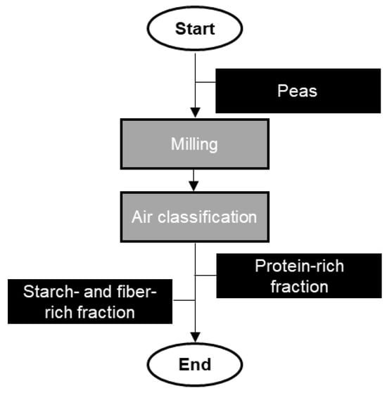 Dry extraction or -fractionation is an alternative extracting method in which sieving and/or air classification techniques are combined to prepare fiber- and protein-rich fractions (Figure 3). For grains and cereals, the very first step in protein extraction is milling the plant source to release the protein bodies from the cells. Since the released material is a mixture of proteins with other macromolecules, including polysaccharides and lipids, the next steps are focused on the separation of the targeted proteins from the mixture of molecules []. This technique is mainly applied for starch-containing crops such as pea or fava beans, to obtain protein concentrates from flour.
