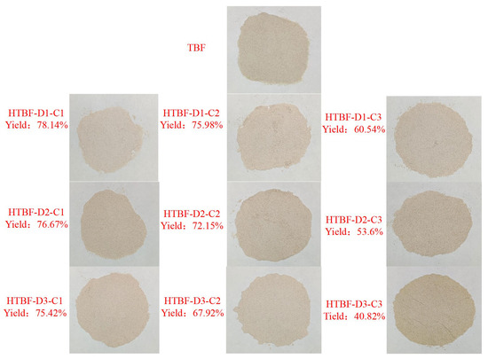 This study utilized a method of crushing combined with screening to remove the husk and bran of Tartary buckwheat, obtaining its endosperm. Therefore, the TBF obtained was rich in starch, with dry basis starch content as high as 91.84%, approaching the starch content of corn and potato starch [24]. As shown in Figure 1 and Table 1, compared with TBF, the brightness of samples treated with 3 mol/L sulfuric acid for 2 and 3 days (HTBF-D2-C3 and HTBF-D3-C3) decreased distinctly, accompanied by a shift towards red and yellow hues. HTBF-D3-C3 exhibited the lowest yield (40.82%). This may have been due to excessive acid hydrolysis at this time, leading to the significant destruction of starch, protein, and other components, resulting in a darker appearance of the particles. Tang et al., also found that acid hydrolysis could significantly alter the morphology and particle size distribution of KGM particles [25].