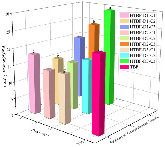 Particle size of TBF and HTBF (different letters in the same figure indicate significant differences (p < 0.05)).