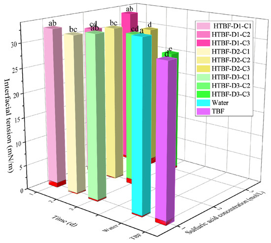 Effects of TBF and HTBF on the oil/water interfacial tension (different letters in the same figure indicate significant differences (p < 0.05)).